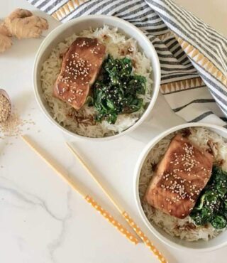 Salmone in salsa Teriyaki con spinaci e riso basmati