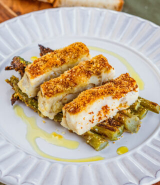 Cominciamo tritando l’aglio. Prepariamo una pirofila con della carta da forno. È il momento di aggiungere gli ingredienti: disponiamo i filetti di merluzzo, gli asparagi, l’aglio tritato, sale e pepe q.b., copriamo il tutto con il pangrattato in abbondanza e un filo d’olio extravergine d’oliva.